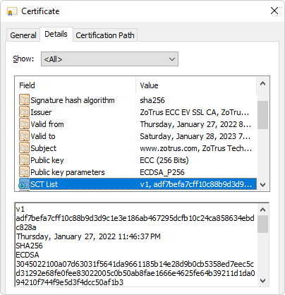 As shown in the figure on the left below, ZT Browser views the certificate transparency log data contained in the SM2 SSL certificate issued by ZoTrus Cloud SSL system, and it does not parse the log data like Google Chrome. However, if you download the SSL certificate and use the Windows Certificate Viewer to view it, as shown in the figure on the right below, it identifies that this SM2 SSL certificate contains the SCT List field, and it can display most of the important information in the SCT data normally, but the signature algorithm of the SCT data cannot be identified.